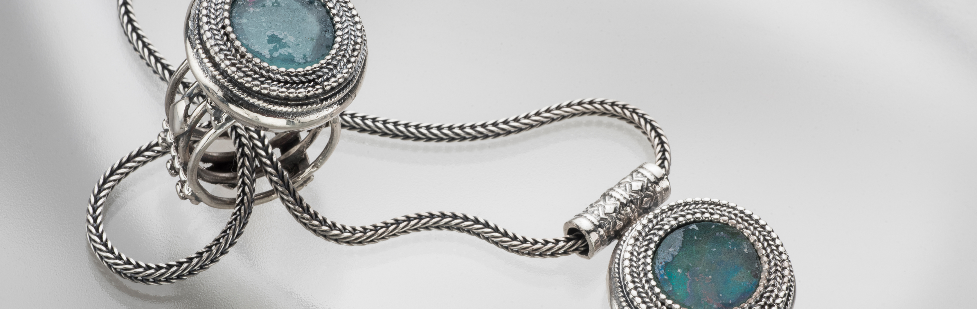 This collection is not only jewelry, but history and fine art as well. The authentic shards of 2000 year old Roman Glass, in hand wrought sterling Silver 925 settings, are heirlooms in the making. The Blue/green color of the Glass reflects the waters of the Mediterranean Sea where it was found and where Rome once ruled supreme. Each of the 3 pieces exemplifies the exquisite art of the Silversmith
