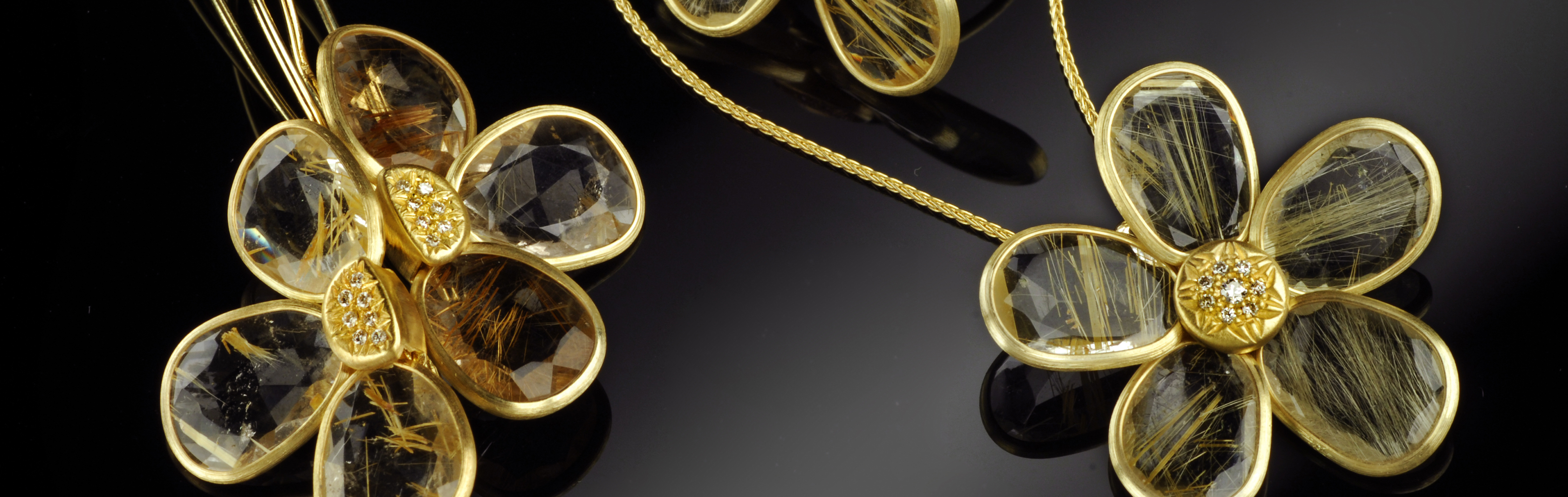 Uniquely designed, handcrafted 14k Gold Jewelry Collection. Rutile Quartz with golden streaks of natural quartz, mounted in handcrafted 14k Gold settings. A unique Jewelry Collection, breathtaking in its simplicity.