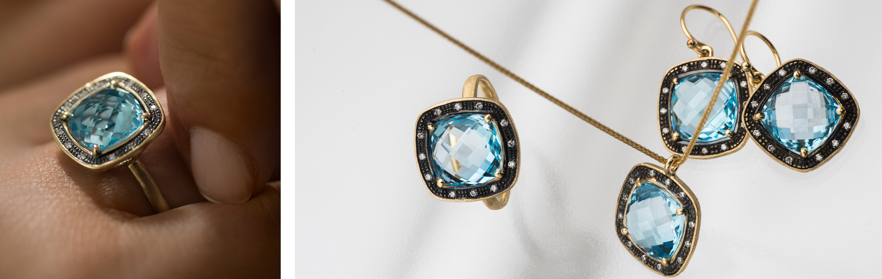 Made of 14k Gold, this collection features sky blue, square cut topaz stones surrounding by diamonds which are set within rhodium. The unique combination of colors and materials allow the featured gemstone to truly shine in it’s setting.