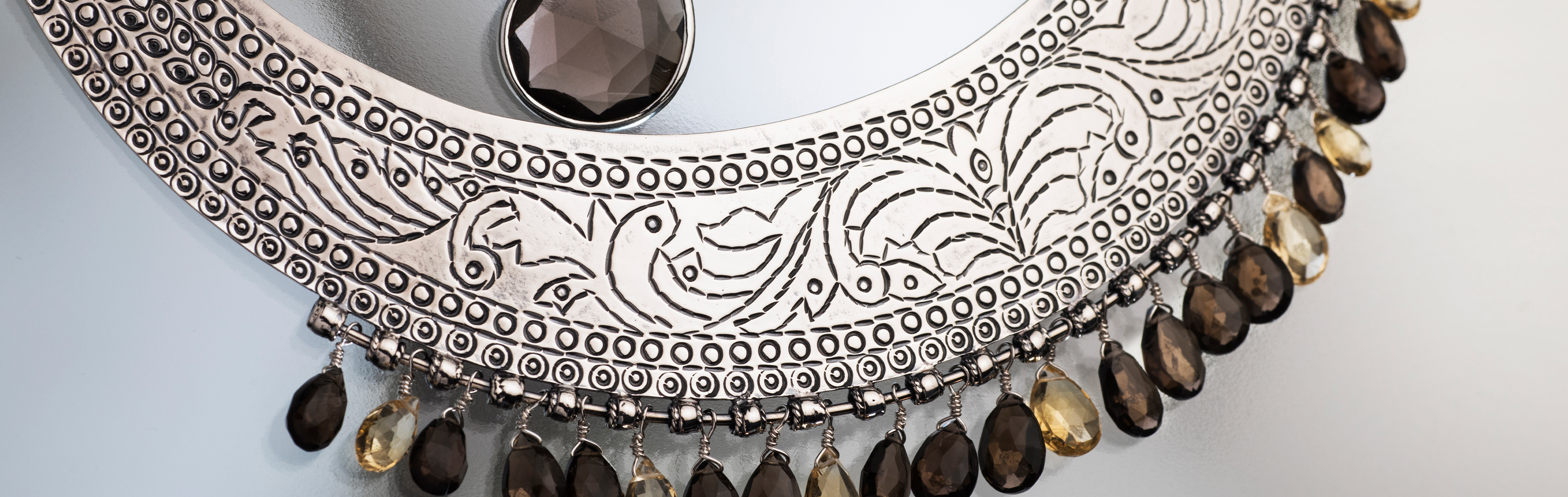 This 2-piece fine sterling silver 925 collection was inspired by the traditional jeweler’s art of the exotic Far East and features in fact a hand crafted choker necklace etched with designs which suggest butterflies, dolphins and exotic symbols. Dangling down from the necklace itself is a string of smoky quartz beads in various natural shades and to complete the look are smoky quartz earrings hanging from a spiral silver shank. Truly one of a kind and fascinating.
