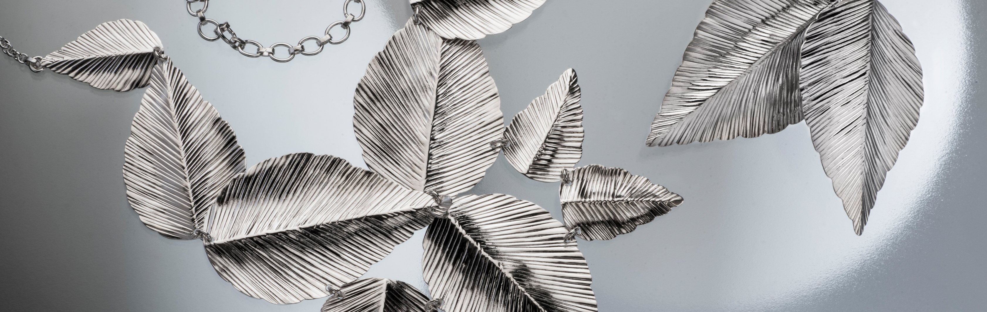 Yet another in the original and interesting GRAS sterling Silver 925 collection of stylized jewelry inspired by leaves in nature and transformed into adornment. Each Silver leaf is delicately etched to resemble the real thing but at the same time is definitely fine artistic jewelry, especially the choker Necklace and matching leaf Earrings dangling down. Limited Edition Collection | 399 pieces made
