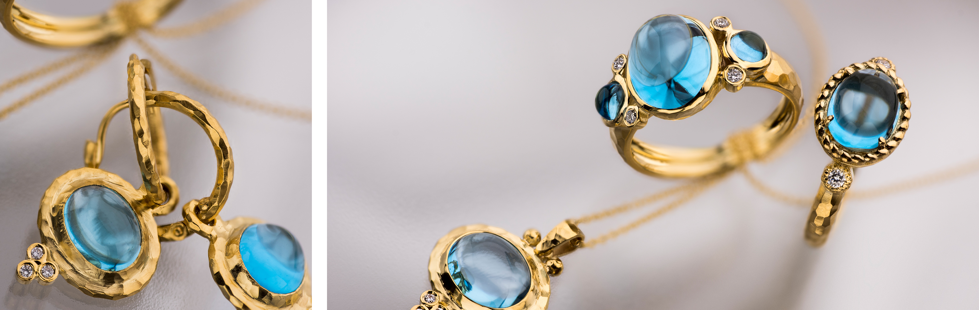 14k Gold Jewelry with gorgeous Sky Blue Topaz and Diamonds. The sparkling blues are reminiscent of a small mermaid in blue seawater and the sun`s rays reflected on the waves, as they break on the shore.
